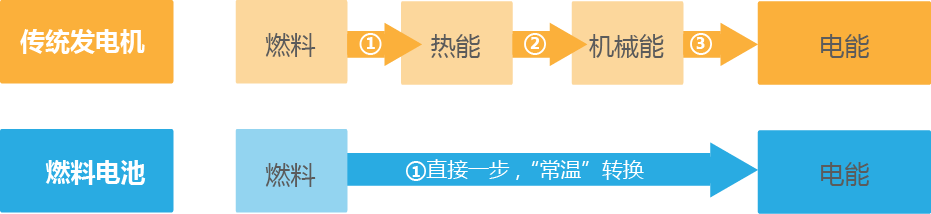 燃料電池直接一步,“常溫”將燃料中的化學(xué)能轉(zhuǎn)換為電能,效率高。